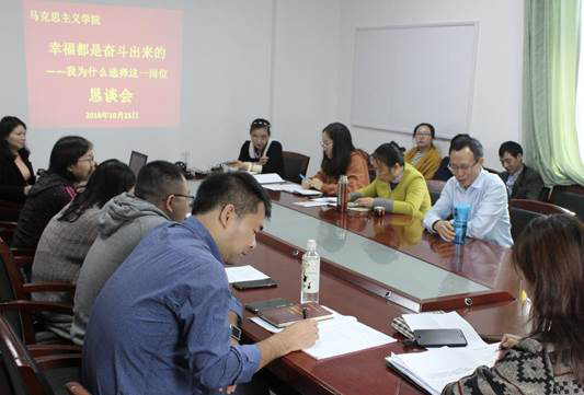 思与法教研室副教授刘宗劲老师,以《换一张笑脸》为题,讲述了自己对教师岗位的坚定选择,“我们生活在最好的时代,生于这个时代的中国,才让我们有机会有平台去选择从事最热爱的事业,这就是人生的幸福”;纲要教研室主任王晨博士回顾,是三代从教的“教师世家”熏陶、师恩影响、教师的崇高使命等原因,促使他选择了更直接地体现人生价值的教师岗位;马克思主义中国化教研室张先梅副教授认为,幸福来源于学生的成长,来源于教育的成果,来源于作为教师的专业能力和敬业精神;青年教师陈思思的幸福感来源于对教师岗位深沉地热爱:“世界上还有哪一种职业能够这么近距离的与那么多纯洁的心灵接触呢?与人的心灵打交道是一门使人上瘾的艺术。”