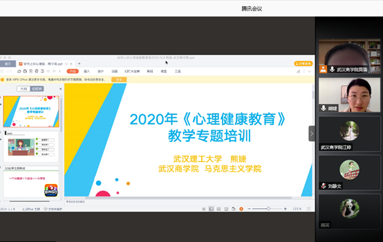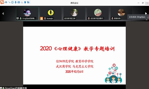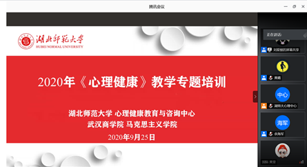为进一步提高教师教学水平,开学伊始,心理健康教研室通过腾讯会议顺利开展《心理健康教育》教学专题系列培训。培训先后邀请了华中师范大学余海军老师、信阳师范学院丁倩老师、武汉理工大学熊婕老师分别进行教法分享和教学展示,心理健康教研室专兼职教师参与活动。