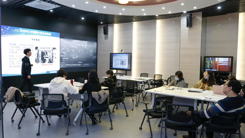 青年教师闻艺以日本召开“东方会议”以及会上形成的“大陆政策”入手,对日本发动对华侵略的背景进行了分析,并用翔实的材料对“九一八事变”“华北事变”“卢沟桥事变”等关键历史事件进行了梳理,阐释了上述历史事件之间的内在联系与脉络。结合闻老师的教学设计与教学呈现,大家各抒己见,畅所欲言,从教学重难点把握、内容导入、教师上课情绪情感调动、师生互动设计、课堂管理、多媒体技术设备使用方面等展开了热烈的讨论。随后,吕芳老师结合自身多年授课经验,就这部分教学内容进行了生动的展示,其充足的课前准备、多样的课程设计、丰富的教学内容使课堂既具备生动性和感染力,也凸显了理论性和思想性,让在场的老师们大受启发、收获颇多。