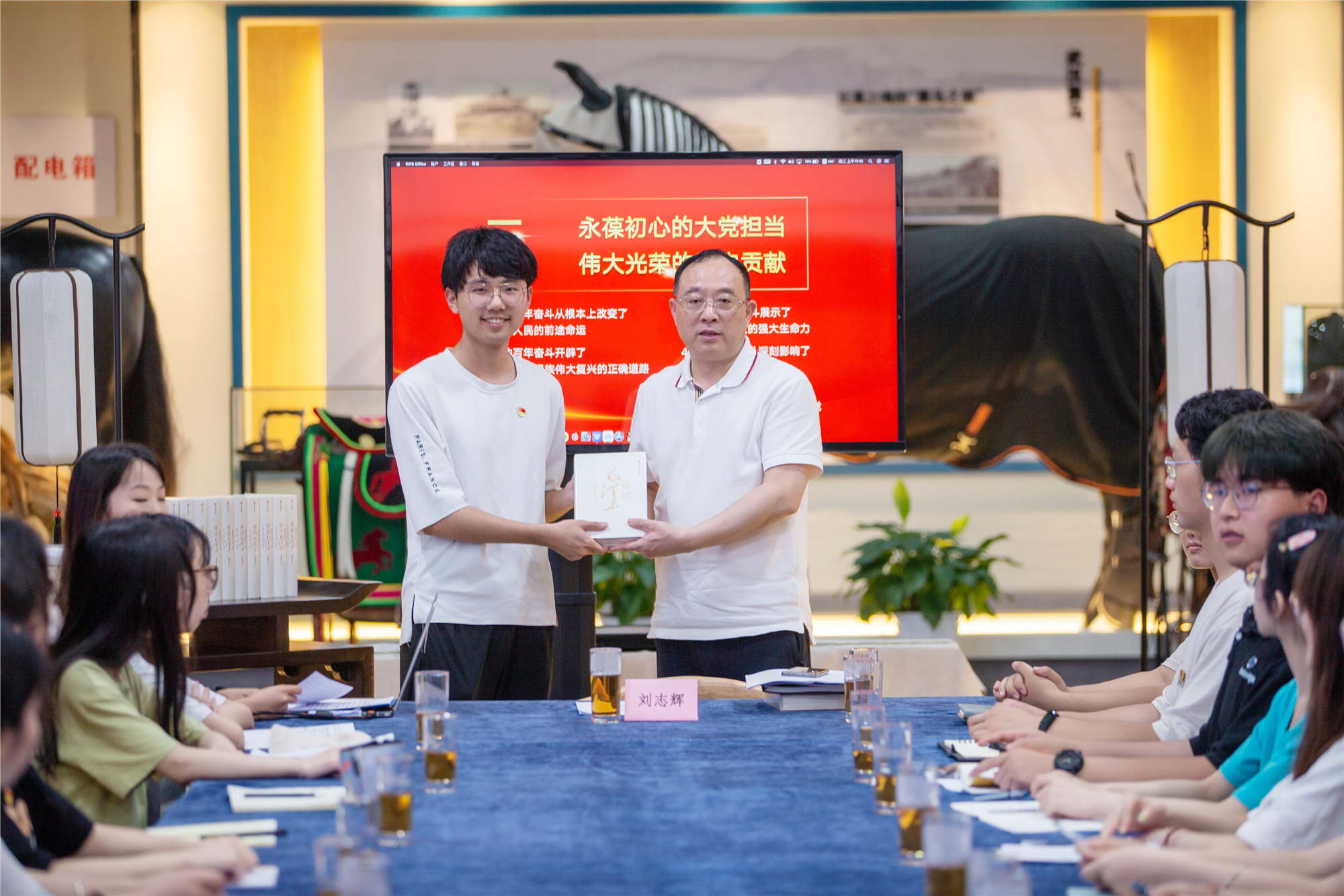 授课后,刘志辉、彭瑜分别为青年大学生赠送《重读毛泽东》《中国哲学简史》书籍。党委班子其他成员也于近日在联系学院讲课,勉励同学们要努力奋斗,在奋斗中为社会做贡献,实现人生价值。