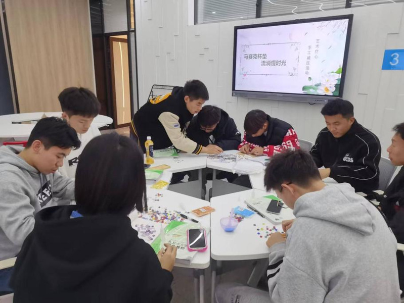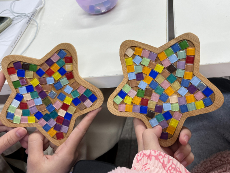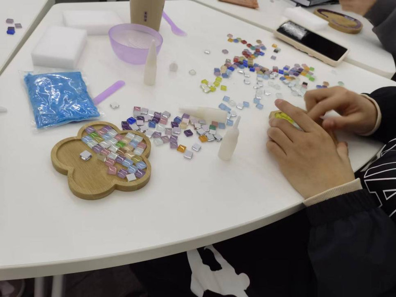 实践活动过程中,老师首先通过认识、感知、领悟3个环节深入浅出地向同学们讲解情绪变化与身心感受的关系,介绍了表达性艺术治疗的相关知识。随后通过手工制作马赛克杯垫这一“值得静思,需要耐心”的艺术工作,指导学生们充分发挥创造性和想象力,完成各自的马赛克杯垫作品。