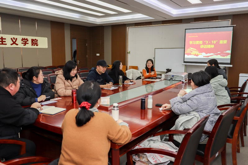 教职工政治理论学习专题学。3月5日下午,各教学部组织全体教师重温习近平总书记“318”重要讲话,大家认真学习后进行了热烈的讨论。“毛泽东思想和中国特色社会主义理论体系概论”教学部杜晓雯老师从一名新晋思政课教师的角度,从教学困惑、解决思路及教改科研方向设想等方面分享了自己的想法。张泽强老师从教学准备,教学管理,教学反馈三个方面分享了自己校外实践教学经验,并对老师们的具体问题分享了自己的看法。“思想道德与法治”教学部张之涵老师表示:自己成为思政课教师以来时常反思“要成为一名什么样的思政课教师?面对学生时我们能教授他们什么?我在学生的心里会是经师还是人师?”通过时常重温习近平总书记对思政课教师“六个要”的期望,明确了自己的努力方向。心理健康教育教学部陈婧老师认为,《心理健康教育》课程服务于完善人格塑造、促进全面发展这一育人目标。在教学中通过课程思政,达到了启智润心和培根铸魂的目的,从而培养全面发展的社会主义建设者和接班人。